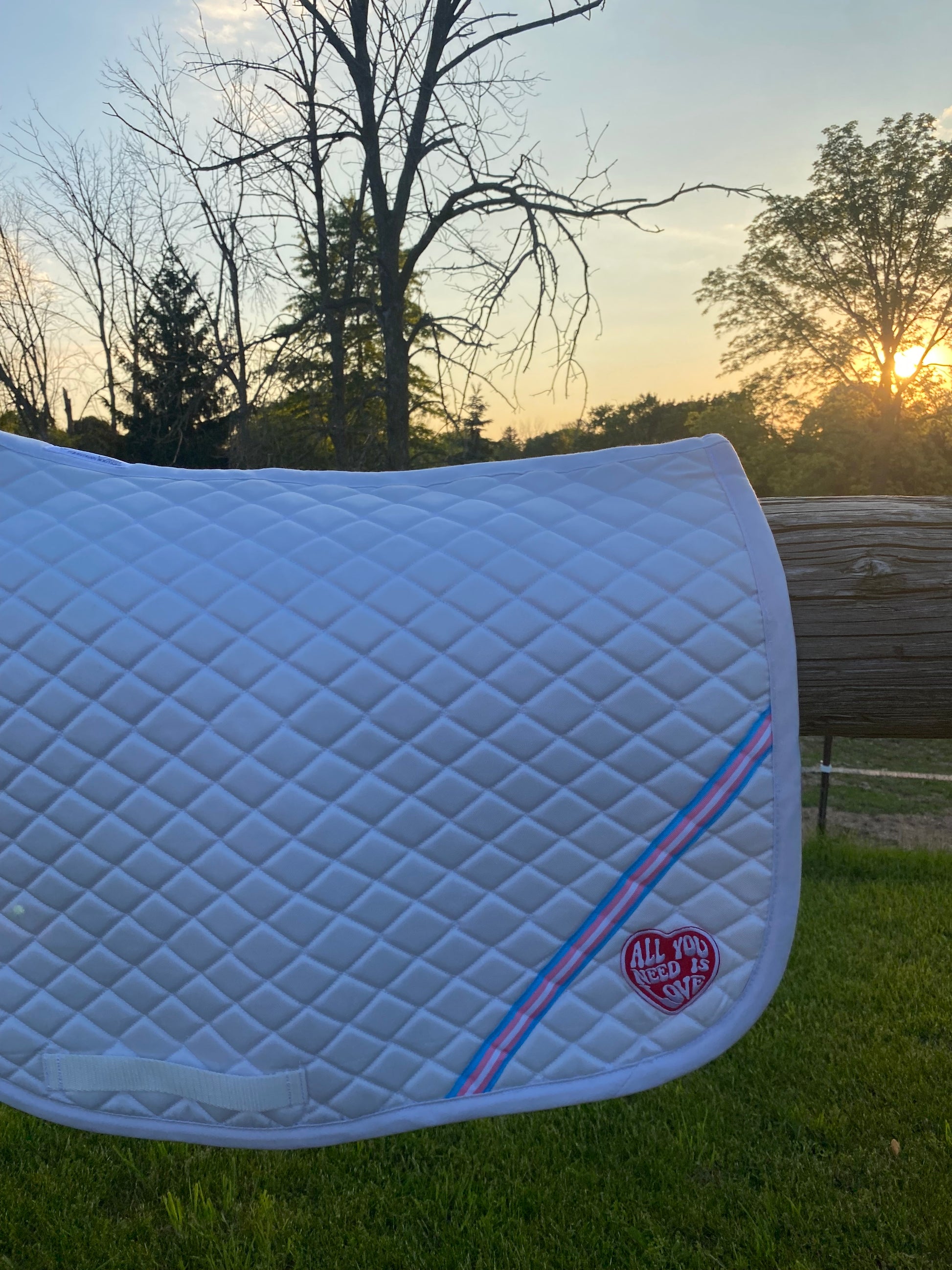 This beautiful white all purpose saddle pad is just the perfect amount of tasteful TRANS PRIDE for schooling, showing, trail riding, even a dog bed if it finds its way to the barn floor! This saddle pad is a constant reminder that - All you need is love! Currently this saddle pad is only available to fit all purpose saddles. Made in collaboration with Fanciful Fillies and with a rare feature - the removal of that pesky billet strap while keeping the girth strap to secure your saddle pad to your girth and saddle.